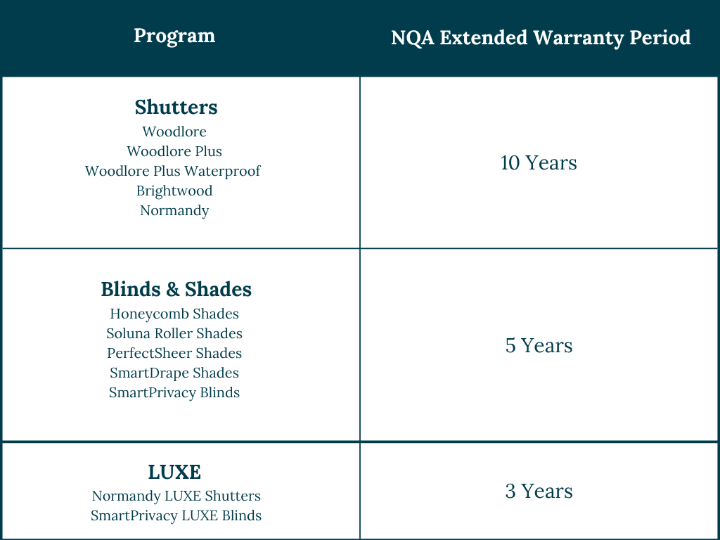 The warranty applies to orders placed with Norman from the 1st of July 2025, for all Shutter programs, Portrait honeycomb shades, SmartPrivacy Wood and Fauxwood blinds, CityLights blinds, Soluna roller shades, roman shades, PerfectSheer and SmartDrape products. The warranty period commences from the shipment date indicated on the order, which can be found on the Norman portal. Norman’s NQA Extended warranty does not cover colourfastness, products that have transferred ownership, been misused, modified, improperly measured, or damaged during installation. Products replaced under this warranty must be the same as the original order placed with Norman.